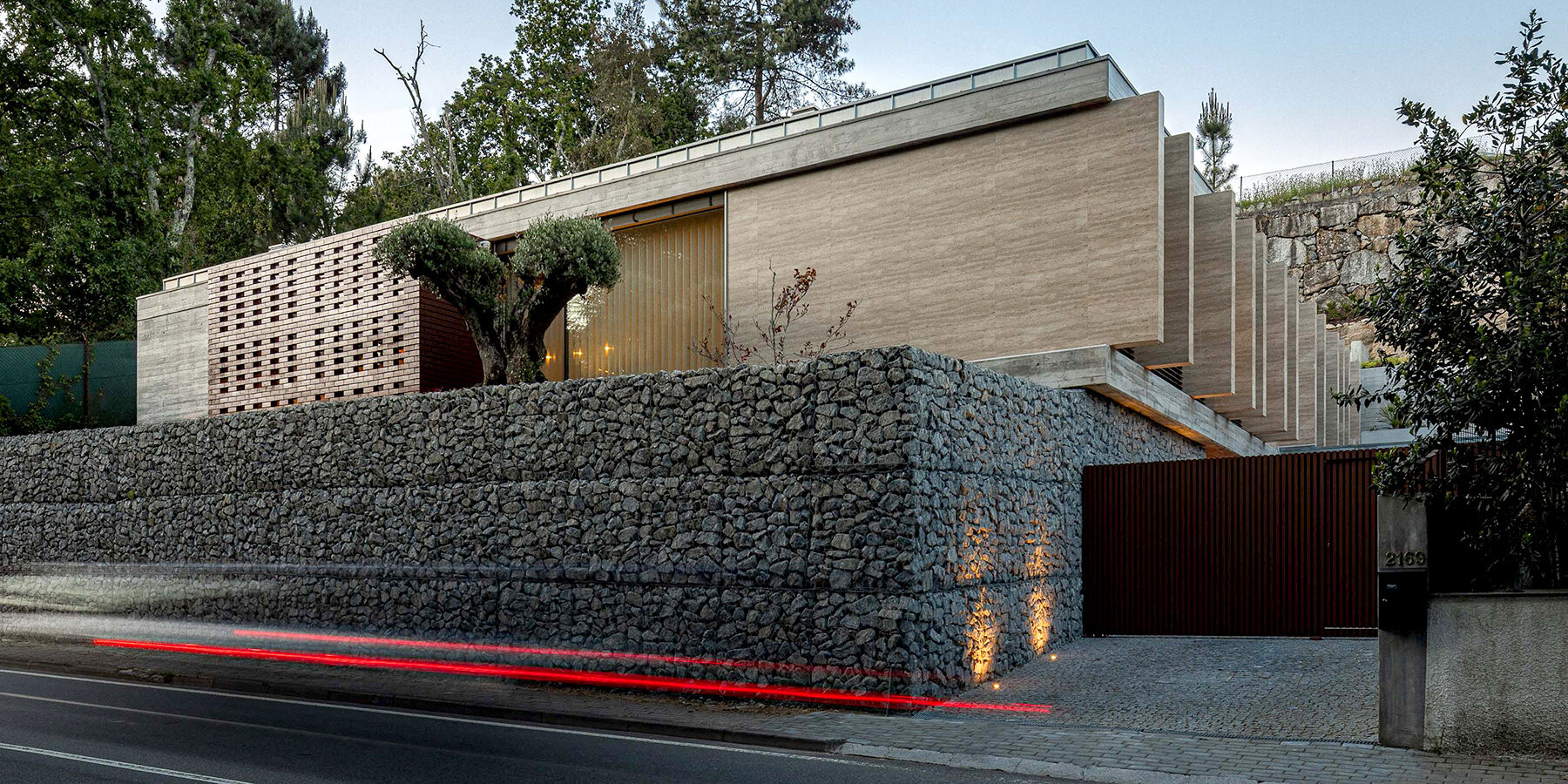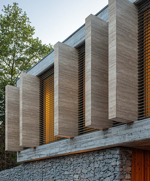 the upper-level facade is shaped by travertine planes
