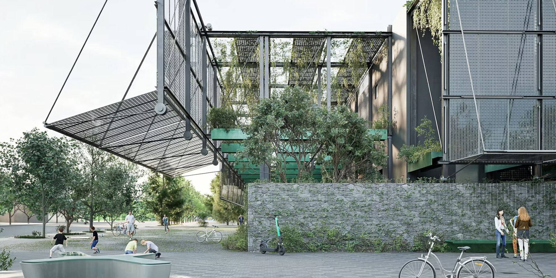 On the south and east facades, photovoltaic panels are installed to capture solar energy. Several of these panels are mechanically operable, adjusting their angle according to the season. During winter, they remain vertical to optimize solar gain, while in summer, they tilt open, creating shaded and rain-protected pedestrian areas. The north and west facades, which face residential zones, employ perforated aluminum cladding with built-in planting troughs. These elements form seasonal green walls that contribute to the building’s ecological performance while softening its visual impact.