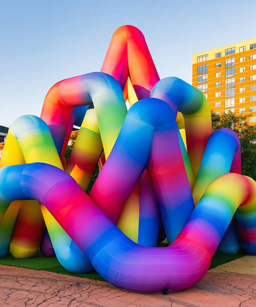 the inflatable installation transforms the city into a geometric playground