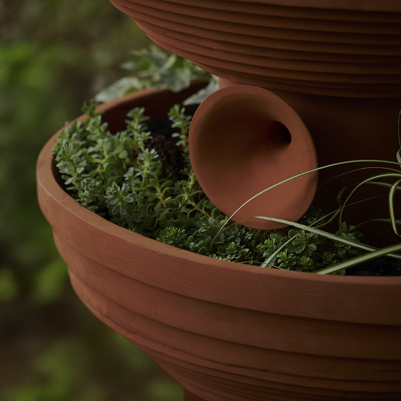 the vases are used as containers for planting, anchoring the folly within the garden