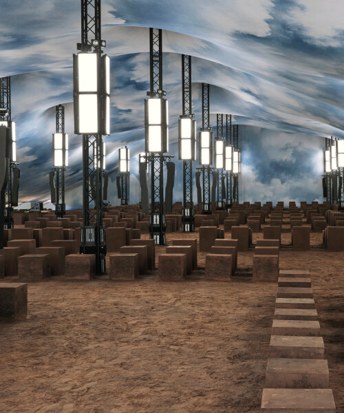 Each truss tower inside the Burberry Summer 2026 show holds multiple rectangular light panels arranged vertically in groups along the height of the structures. These lights shine onto the runway and highlight the collection throughout as they are placed evenly across the runway length, creating a regular rhythm through the space. Speakers are also attached to the towers, playing the music that backdrops the show. The audience sits on cube-shaped blocks placed in straight rows, their surfaces resembling compacted soil. The rows of cubes were divided by the runway path in the middle, and their color matches the ground covered in an earth-toned material.