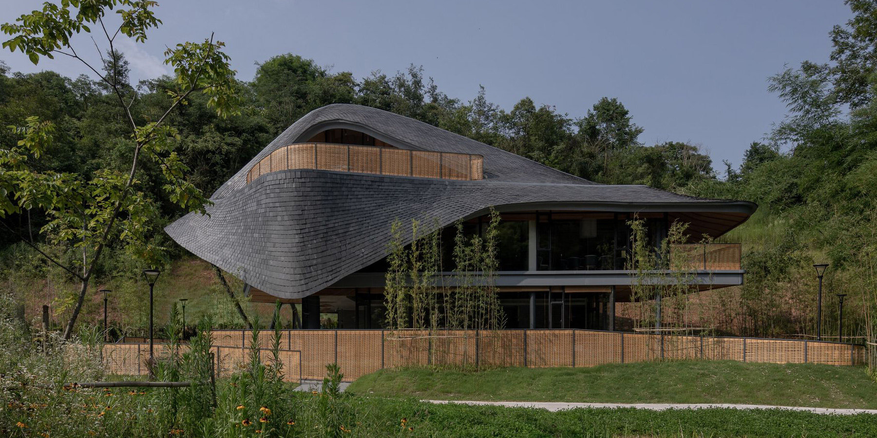 three curved steel beams, generated by digital modeling, support the continuous roof