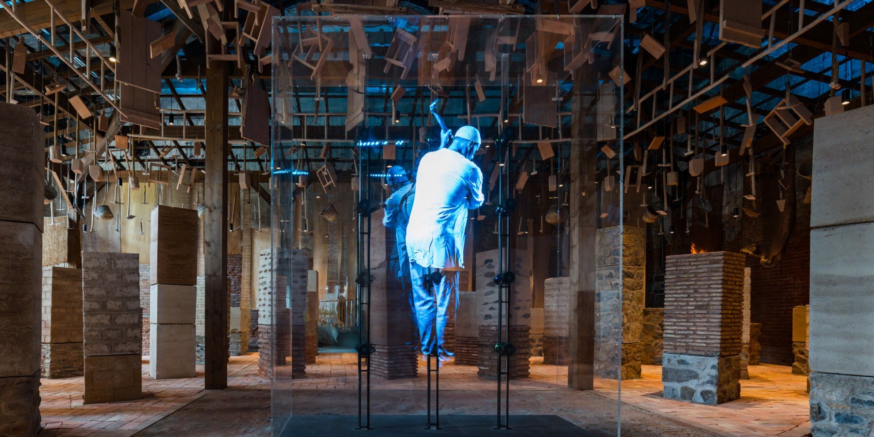A hologram sits at the center of the space, representing the human condition and ancestral knowledge