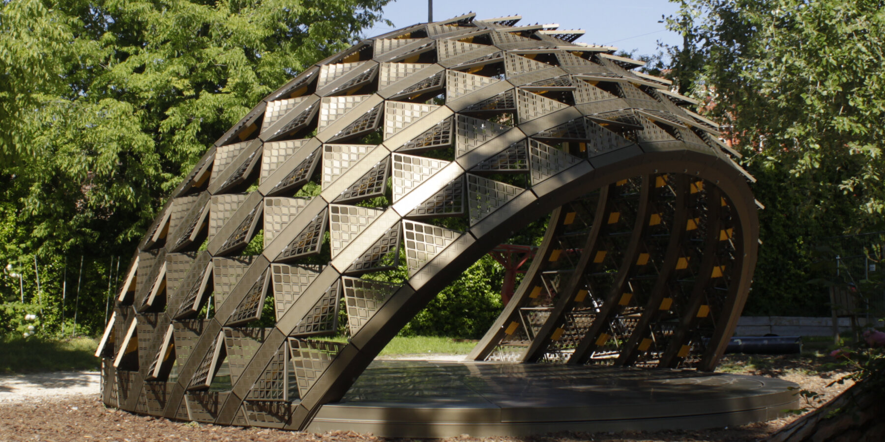 the frame holds triangular panels fitted with perforated metal screens | photo by Jaap Heemskerk