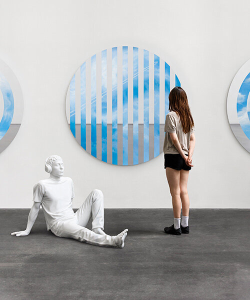 The Berlin-based duo, known for sculptural interventions that probe identity and belonging, uses the gallery’s architecture as both stage and subject. Each artwork appears at full scale in the main hall, while exact half-size versions are replicated in a carefully constructed miniature of that same space.