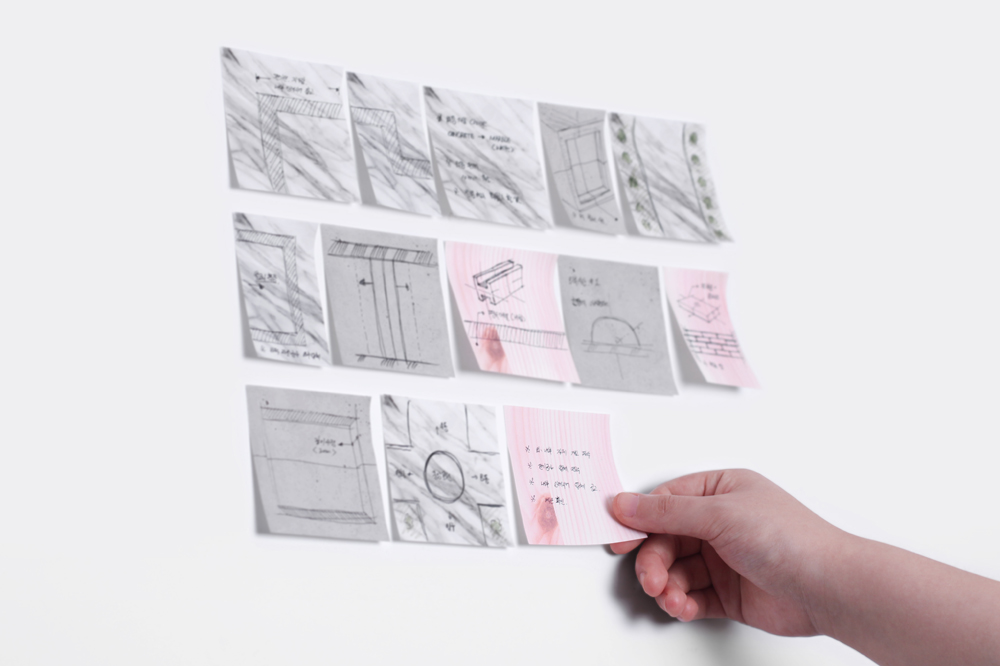 As wonderful structures and building have been created by adding wisdom and wish of the humankind to the natural components, this little product is hoped to be a tool which stimulates various creativity beyond the function of being a memo note. Sticky leaf block series is composed of 3 different kinds of products (wood, marble, concrete) and 2 different sizes (large, small).