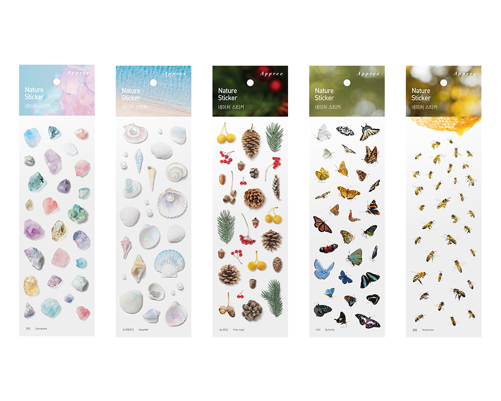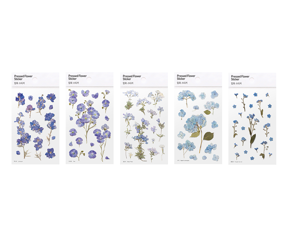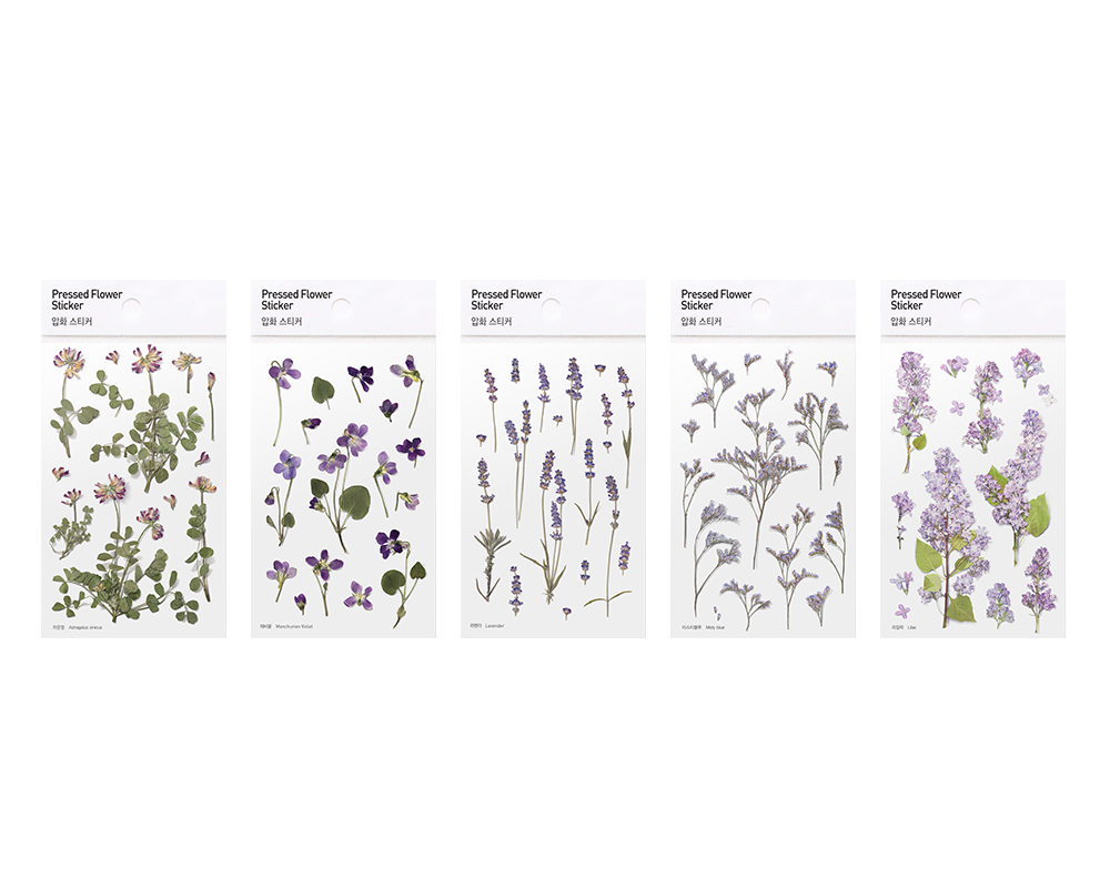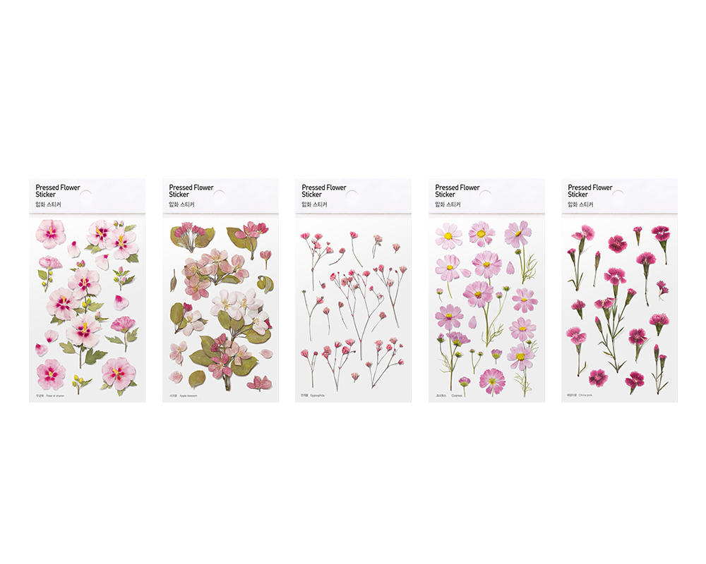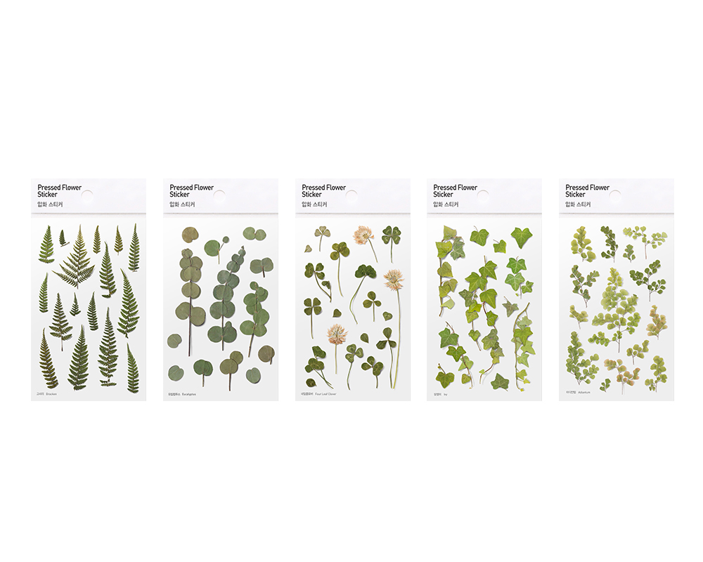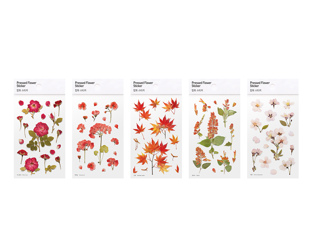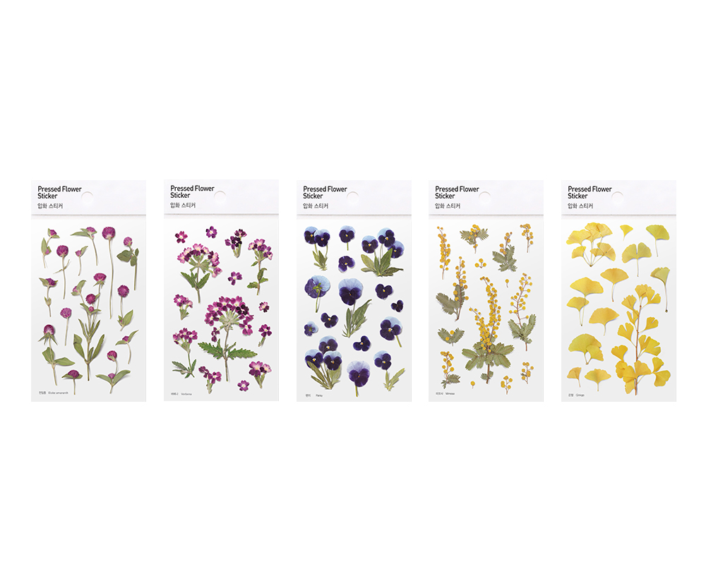 Pressed flower type stickers are made by pressing flowers and leaves. We added minimal design and tried to maximize the natural beauty in itself. This realistically portrayed pressed-flower sticker are naturally merged into wherever we want, making it different place and giving it a new feeling.