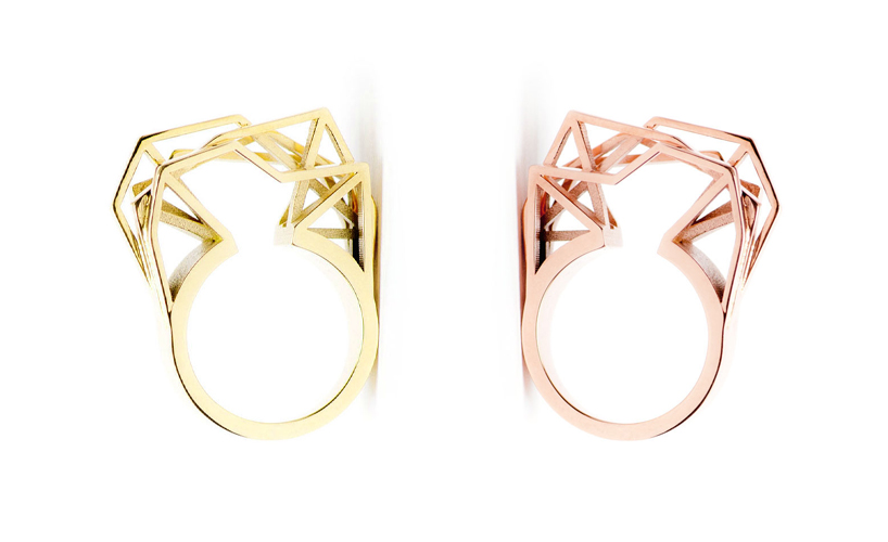 The brass and silver rings are first 3D printed in wax, then cast and carefully hand polished. The brass rings are then 23,5 ct gold plated.