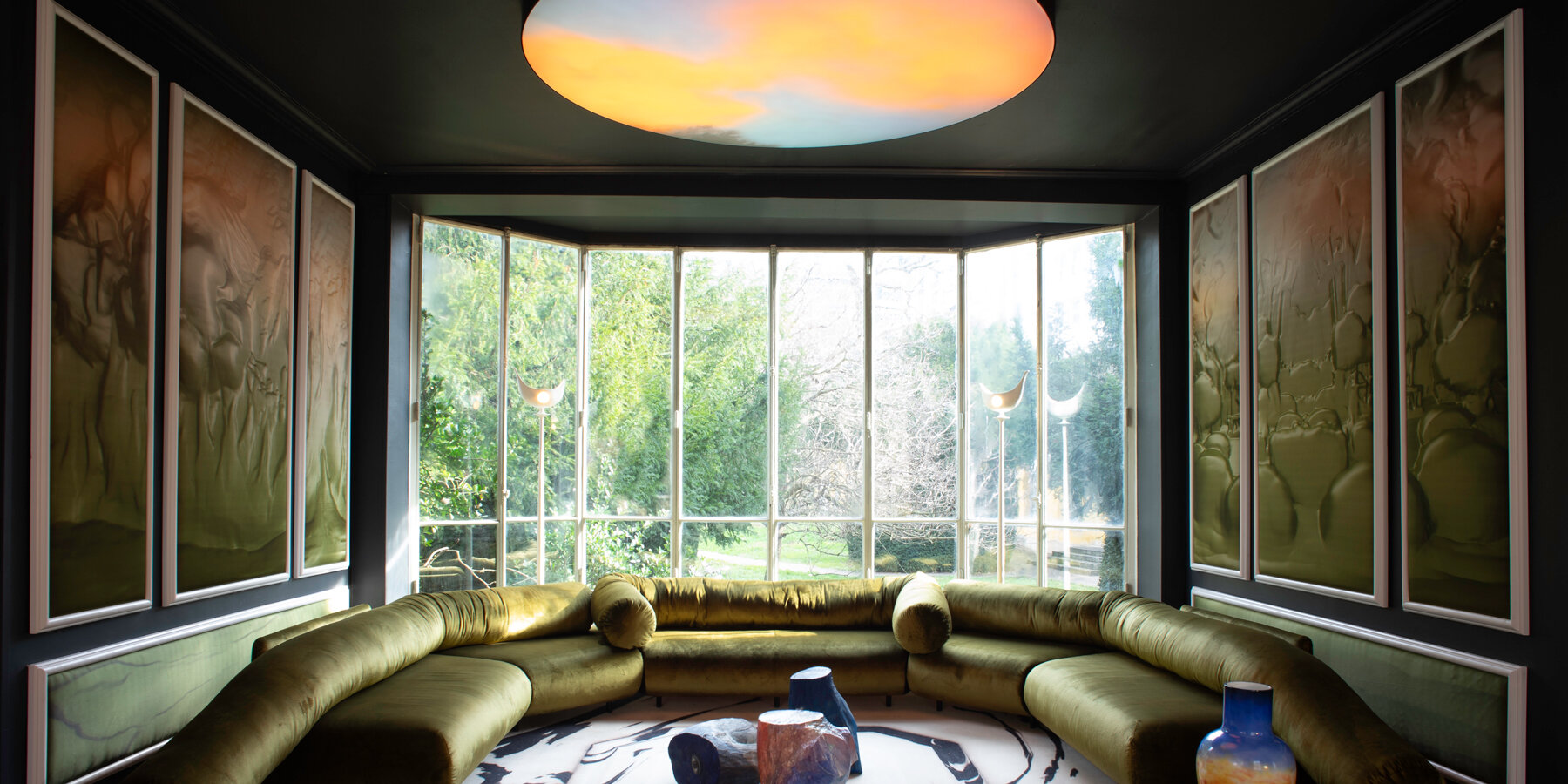 overhead, a luminous ceiling disc evokes a shifting sky