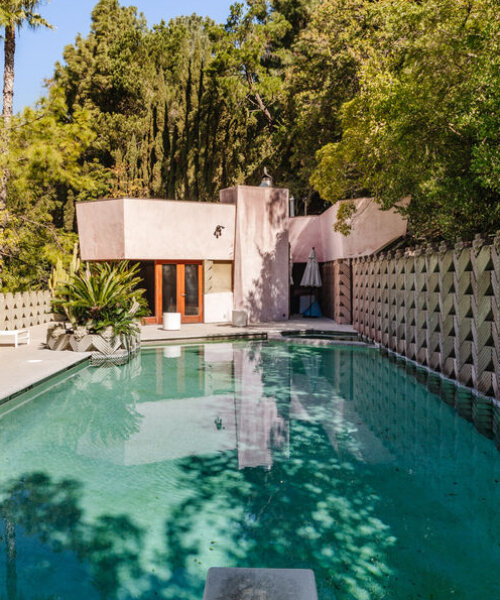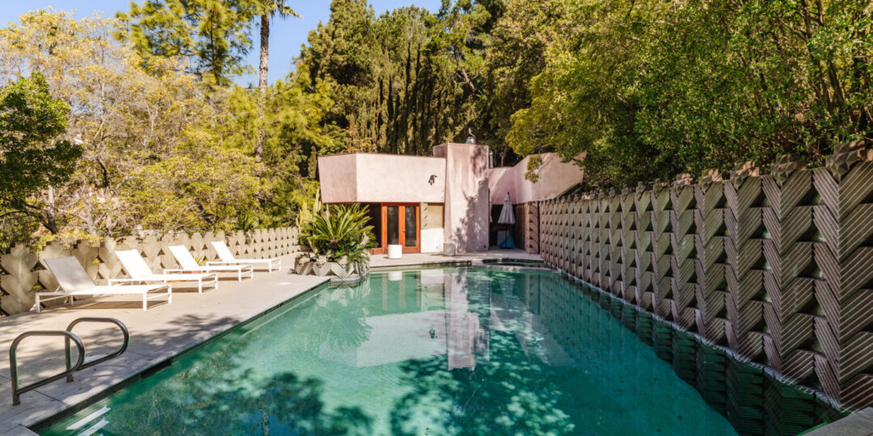 David Lynch acquired the neighboring properties at 7029 and 7035 Senalda Drive of his mid-century Compound to expand his residence and include his workshop and studio. The listing includes the filmmaker’s private editing suite and screening room within the residential structure, complete with the acoustic treatment as well as video and audio equipment. In 1991, the filmmaker commissioned Eric Lloyd Wright, Lloyd Wright’s son and Frank Lloyd Wright’s grandson, to design the pool and pool house, creating what architectural historians would recognize as a rare example of three-generation family design continuity on a single property and resulting in a pool house design that complements the original 1963 structure.